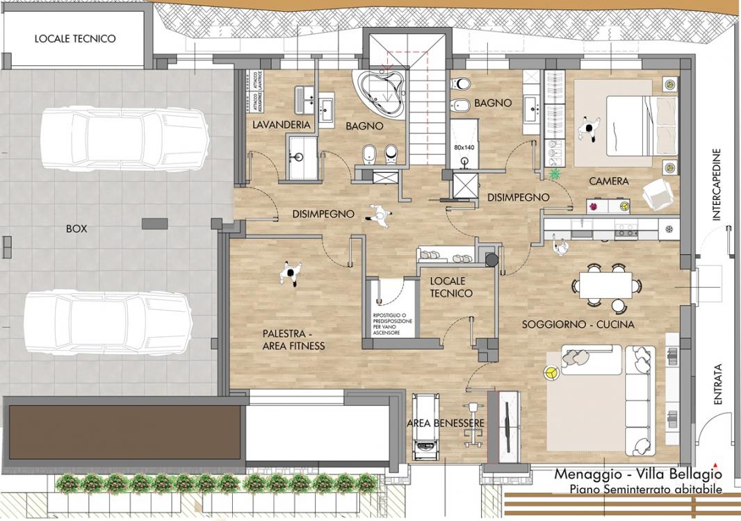 Untergeschoss: Garage für 3 Autos, Taverne, Badezimmer, Keller und Technikraum.